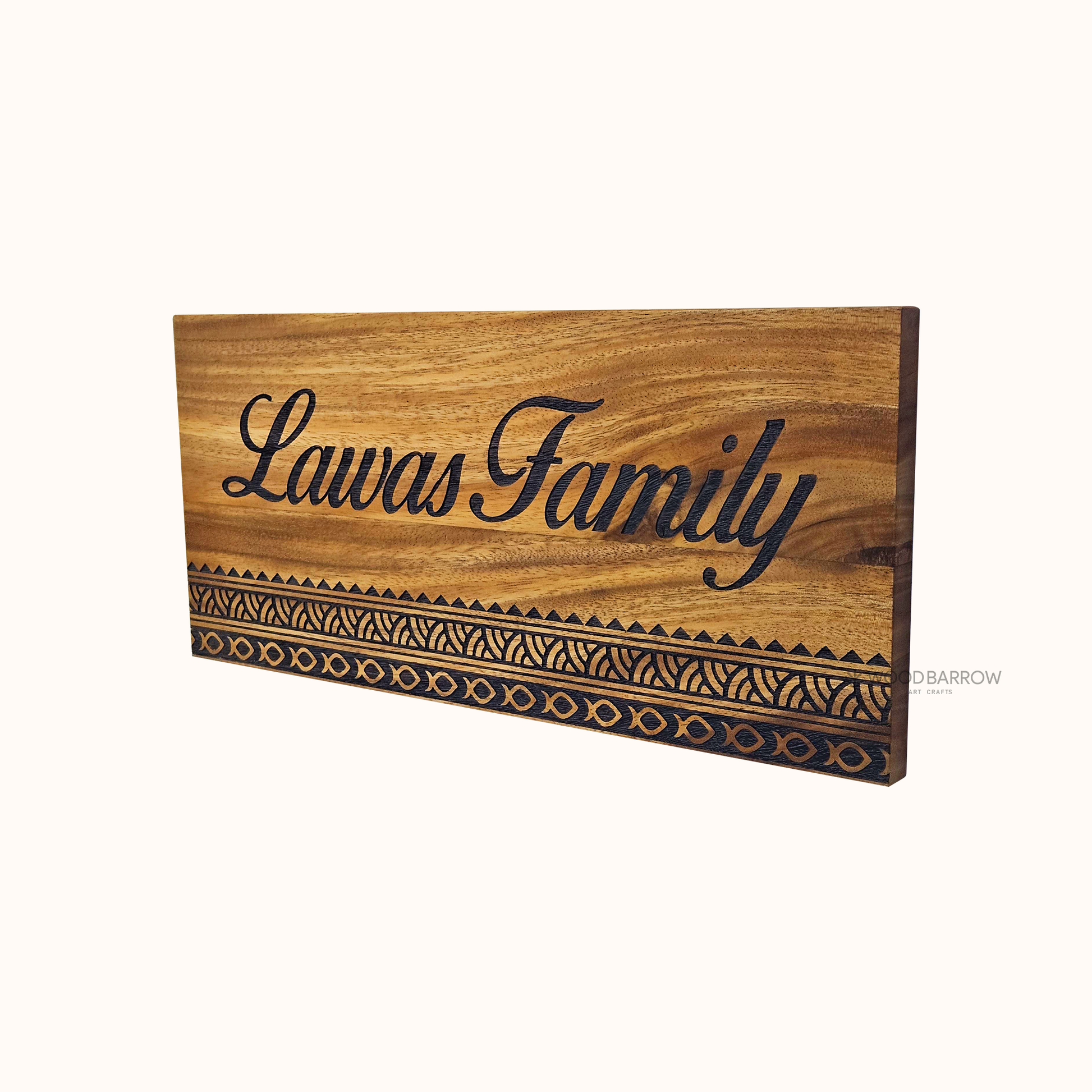 Make a lasting impression with this beautifully crafted Acacia wood name plate, measuring 44cm by 20cm. Known for its warm tones and durability, Acacia wood provides a rich, natural backdrop for the intricately engraved name and decorative design.