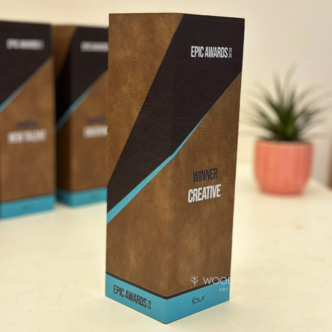 The meticulously crafted wooden column, wrapped in high-quality leather, showcases unparalleled attention to detail and durability. Perfect for recognizing milestones, achievements, and special occasions, this trophy serves as a lasting tribute to success and excellence.