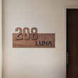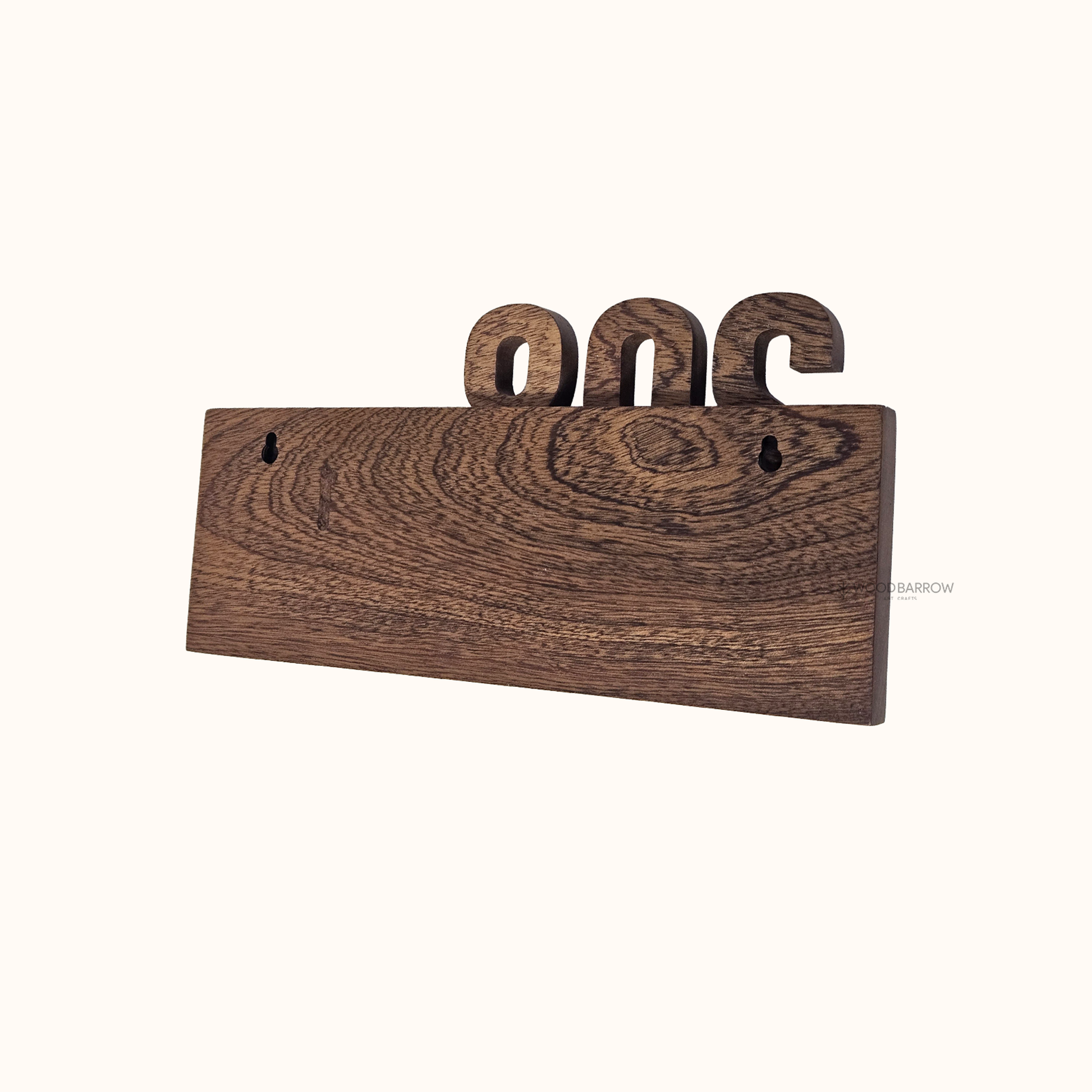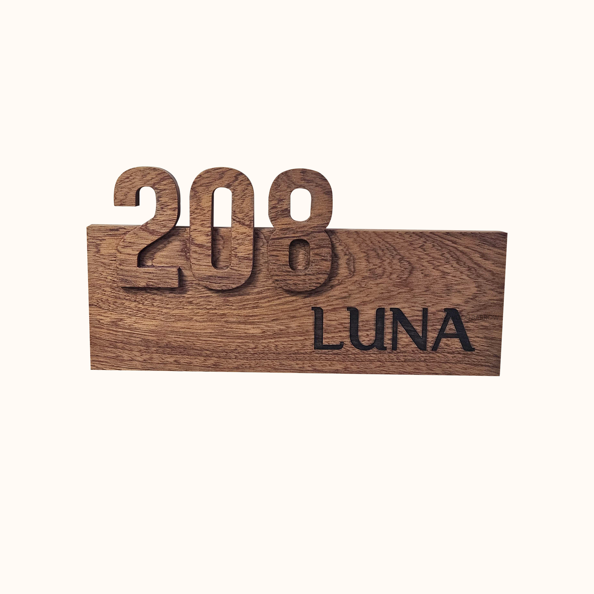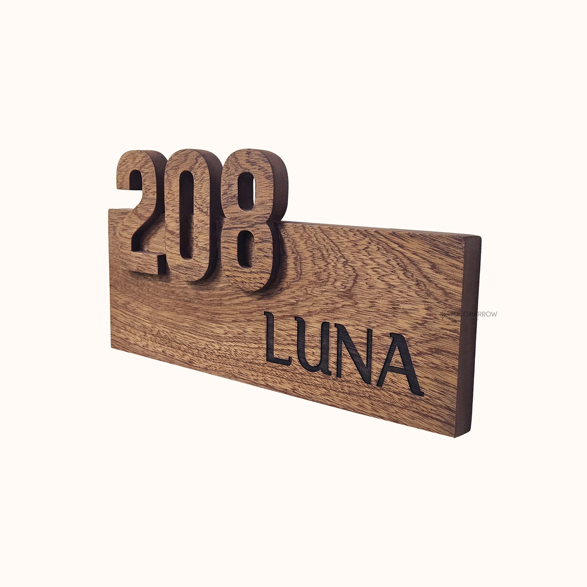 Elegant mahogany wood villa number plate – personalized and crafted for sophisticated home entrances.