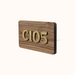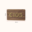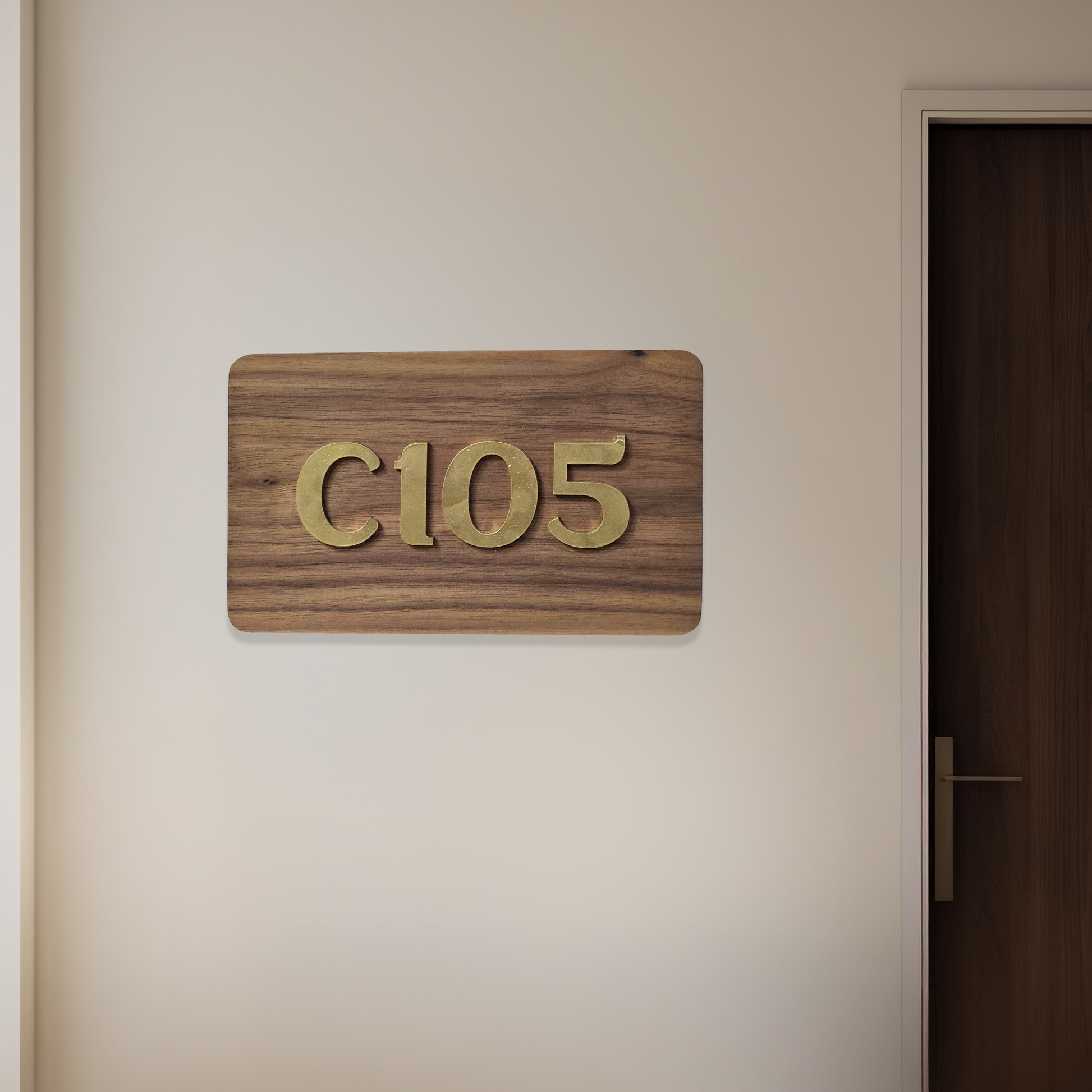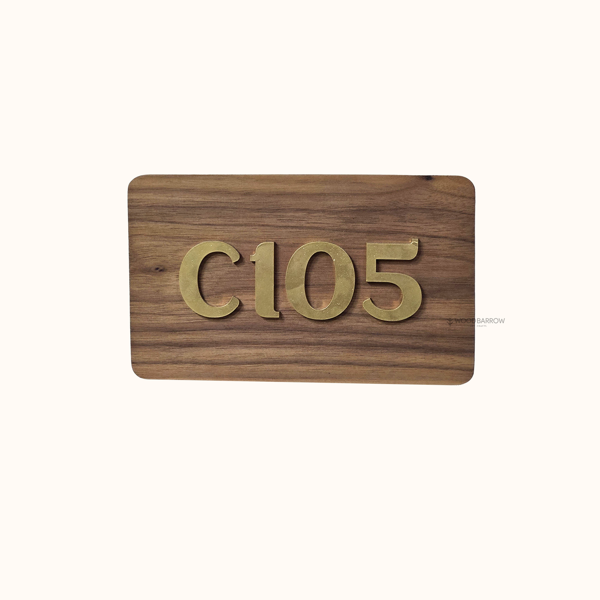 Crafted from rich walnut wood known for its deep tones and durability, the plate is finished to enhance the natural grain, creating a sophisticated backdrop for the shimmering golden numbers.