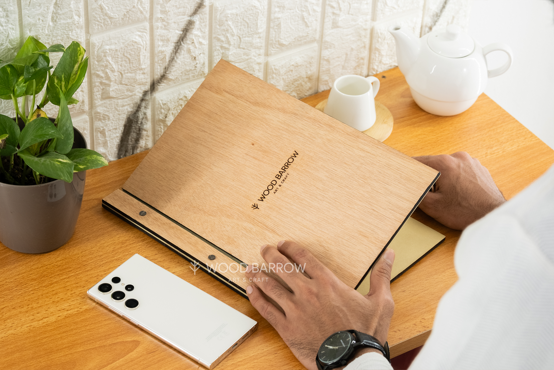 Elevate your dining presentation with our Wooden Folding Menu Holder featuring a luxurious leather cover. Crafted with sophistication in mind, this menu holder combines the natural charm of wood with the timeless elegance of leather, creating a stylish and functional display stand for menus and specials. The folding design offers versatility and convenience, allowing for easy storage and transportation when not in use. Whether placed on tabletops, bars, or reception desks, the sturdy wooden construction and premium leather covering make this menu holder a standout accessory in any dining setting. Perfect for restaurants, cafes, bistros, or events, our wooden folding menu holder with leather cover adds a touch of refinement to your culinary presentation. Make a lasting impression on your guests with this elegant display stand that seamlessly blends style and functionality...