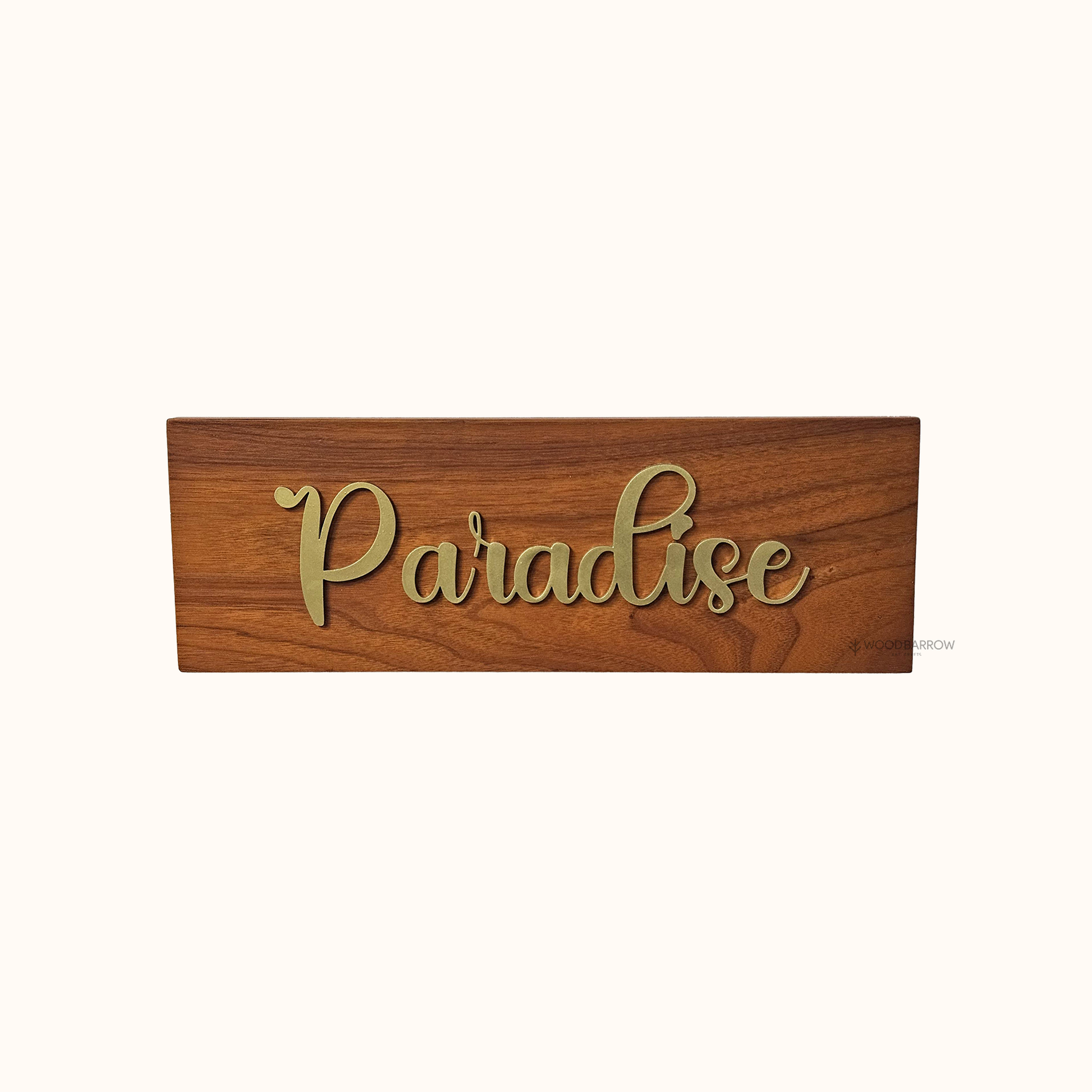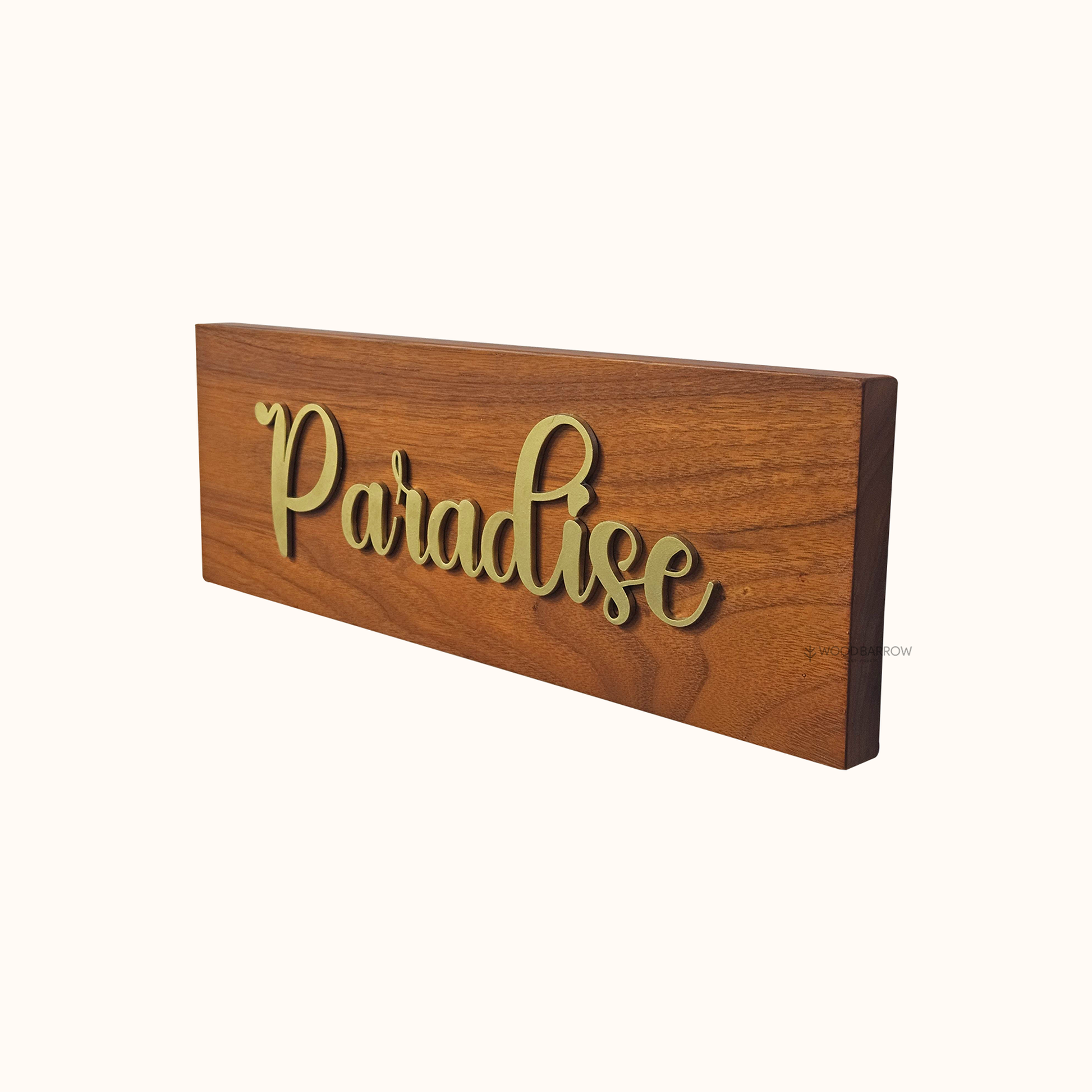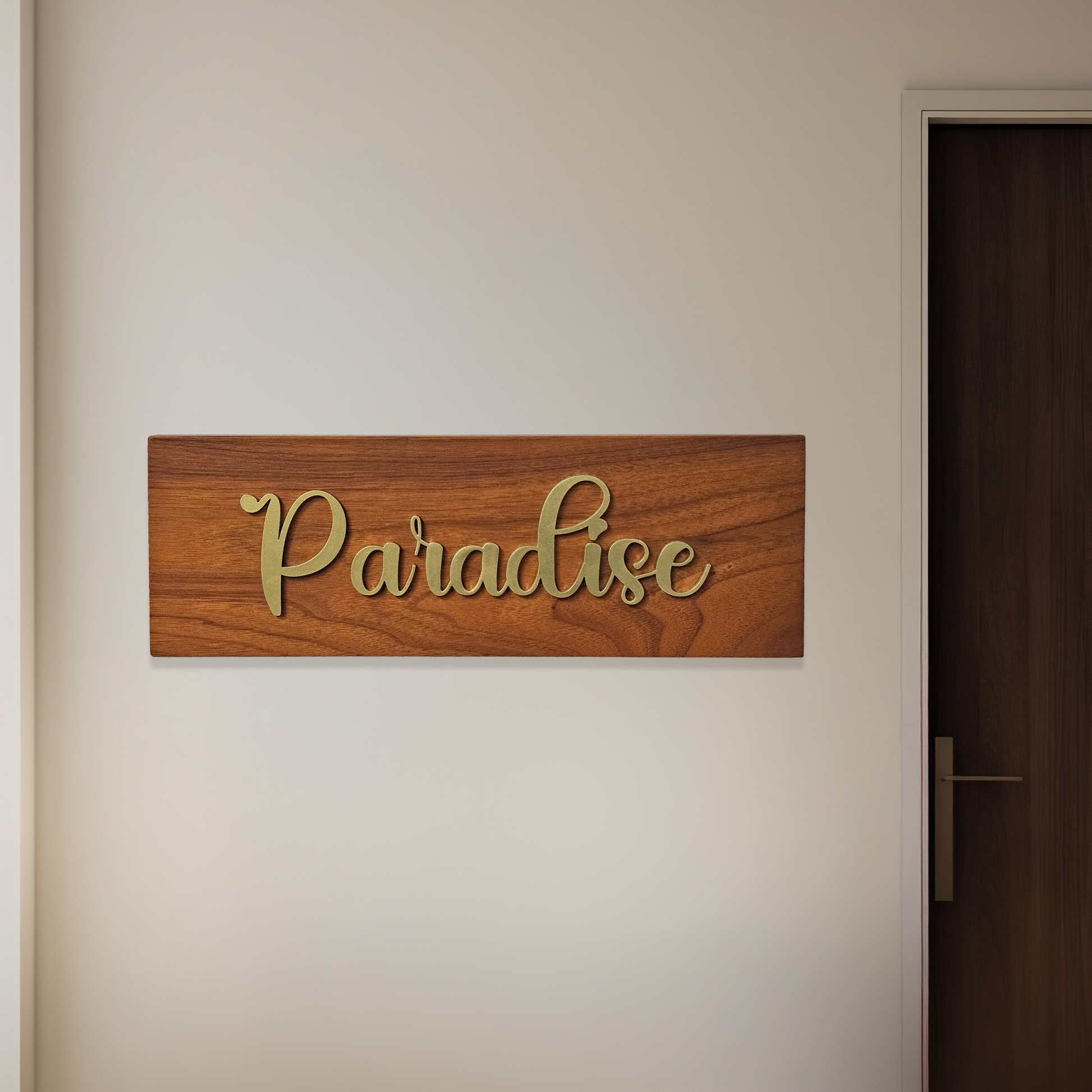 Refined wooden name plate featuring luxurious golden acrylic letters — perfect for sophisticated home and villa entrances.